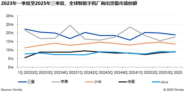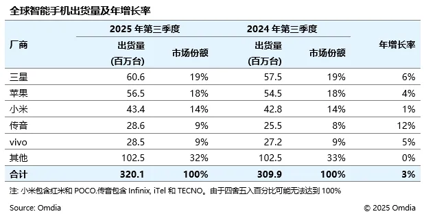 Omdia 报告 2025Q3 全球手机出货量:三星同比增 6%、苹果增 4%、小米增 1%、传音增 12%、vivo 增 5%