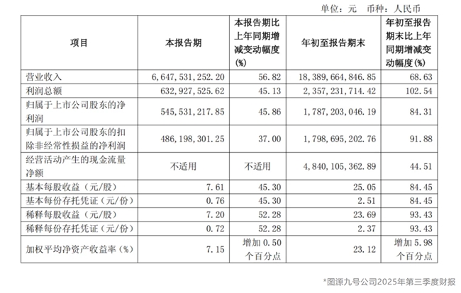 10月24日,九号公司2025年第三季度财报透露,九号公司单季营收66.5亿元,同比激增56.82%;归母净利润5.5亿元,同比增长45.86%;前三季度营收约184亿元,归母净利润约17.9亿元。