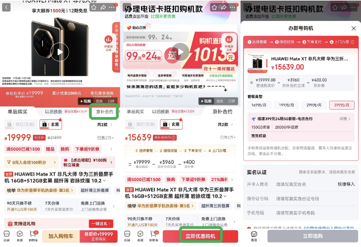 消费者到京东APP搜索想要购买的3C数码产品,选择京东自营商品,点击商品图下方的“京补合约”,然后点击“立即优惠购机”,就可以选择话费套餐,输入身份信息,勾选办理协议,随后下单就能享受补贴了。线上点几下完成下单后,京东快递小哥将上门协助消费者完成信息核验和套餐激活等流程,一站式搞定3C数码好物、新号卡、新套餐,足不出户就能省钱购机。