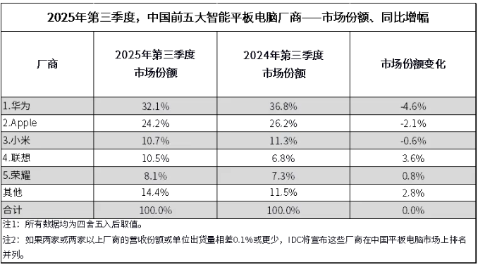 IDC 报告:2025 年 Q3 中国平板电脑市场出货量 849 万台同比增长 10.9%,华为、苹果、小米前三