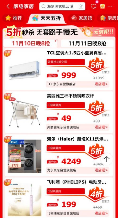 11月10日和11日晚8点同步开启五折秒杀限量抢,涵盖多品类热销单品,TCL空调大1.5匹小蓝翼到手价仅需999元,海尔朗境X11洗烘套装5折秒杀后到手价4249元,还有199元的飞利浦电动牙刷S5、2299元的老板M2净烟机、1727元的三星65DU8000C平板液晶AI电视等多款人气产品,让您的焕新计划省心更超值。无论是高端家电还是实用家居,用半价就能带走心仪好物,实现家的完美升级。