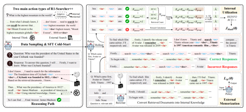 他们的《R1-Searcher++》论文,就是这种思路的集中体现。它同样使用强化学习,但核心目标是训练智能体形成一种“判断力”和“记忆力”。“判断力”指的是,智能体要自己学会,什么时候可以依赖自己的内部知识,什么时候必须向外部环境(如搜索引擎)求助。这解决了智能体与现实交互中的一个核心成本问题:减少不必要的动作。