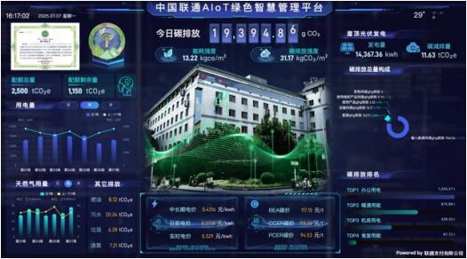 在楼宇节能领域,中国联通依托人工智能物联网(AIoT)技术,自主开发楼宇碳中和数智化解决方案,覆盖活动数据智能采集、智能调度、模型测算与一键生成标准化报告等功能。系统通过智能化电表与传感器自动采集数据,实现空调、照明、通风等设备的感知控制与节能优化,为楼宇低碳转型提供可复制模板。