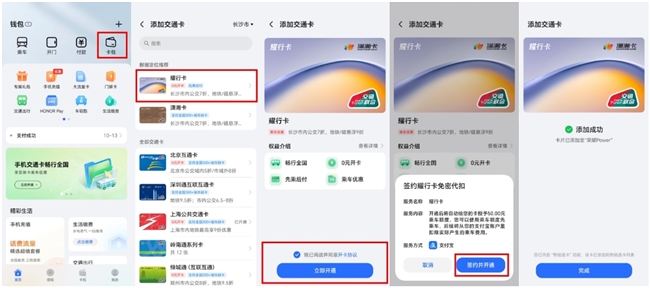 在办理流程上,耀行卡的开通方式简单快捷,打开“荣耀钱包”(10.0.2.304及以上版本),点击“卡包”添加交通卡,搜索并选择“耀行卡”,即可按照指引快速完成开卡。开通成功即获得乘车额度(非免费额度),刷卡乘车时消费一笔自动充值一笔。当用户想要更换设备或不再需要相关服务时,也可进入耀行卡服务管理页面关闭服务。