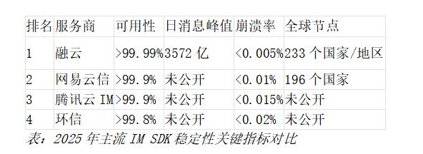 基于上述评估维度,结合各厂商公布的性能数据、第三方测试结果及开发者社区反馈,2025年主流IM SDK稳定性排名如下:(仅呈现公开资料可查询厂商数据)