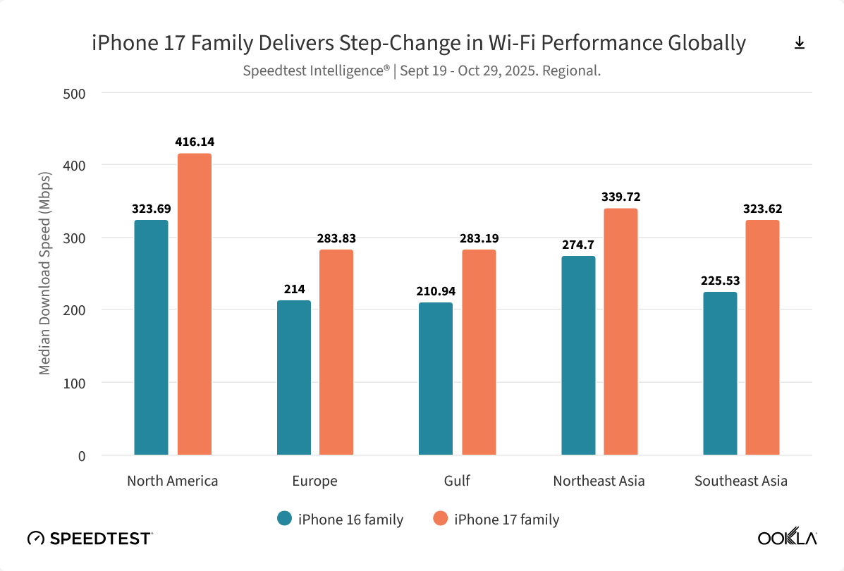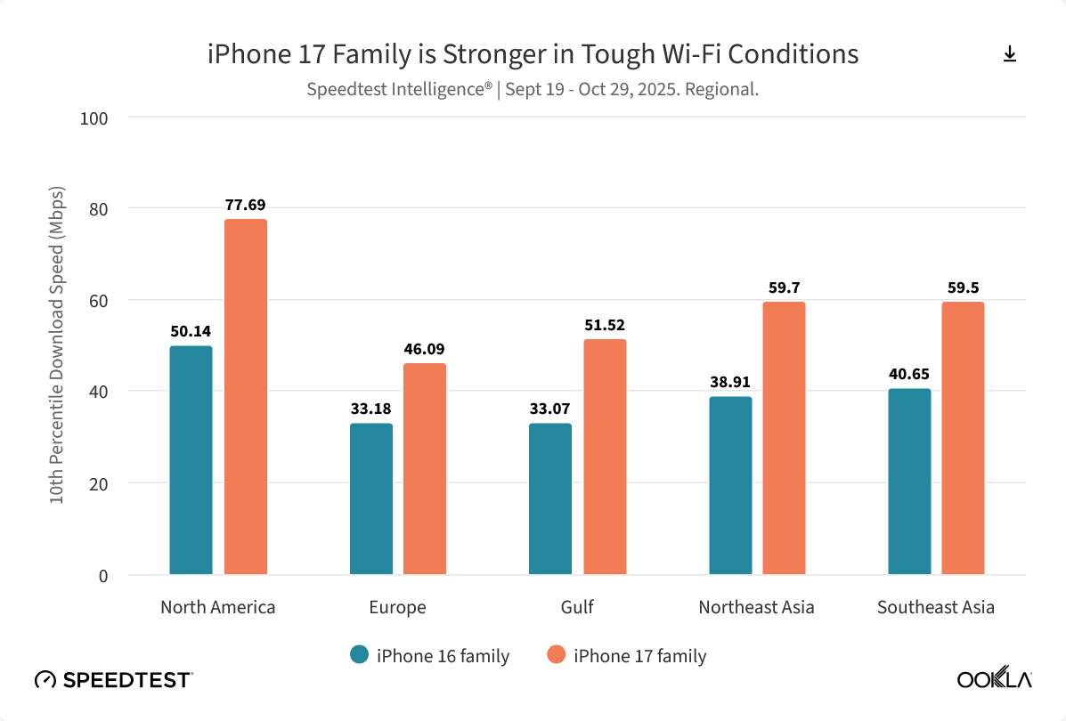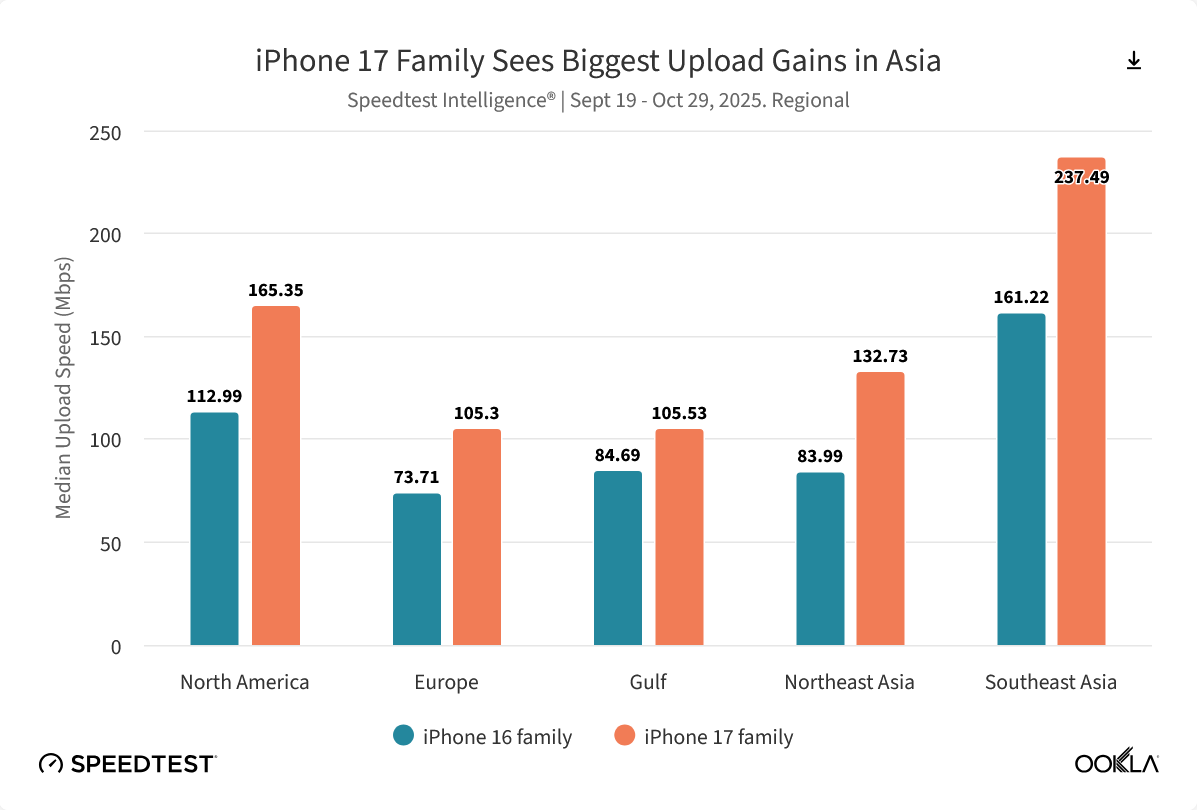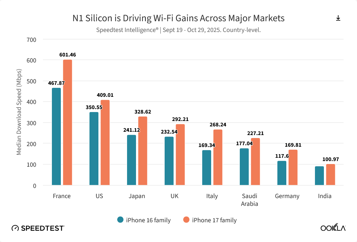 11 月 18 日消息,测速机构 Ookla 昨日(11 月 17 日)发布最新《Speedtest Intelligence》报告,指出 2025 年成为 Wi-Fi 技术竞争的关键年份,苹果公司正式在 iPhone 17 系列中推出其首款自研无线网络芯片 N1,相比较 iPhone 16 系列,全球上传和下载中位数增幅均达到 40%。