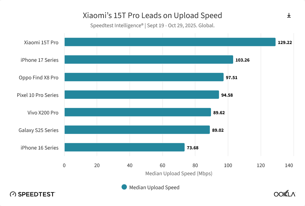 而在上传性能和延迟控制方面,搭载联发科天玑 9400 (+) 平台的小米 15T Pro 表现最为抢眼,其全球中位数上传速度和多服务器延迟(15 毫秒)均排名第一。