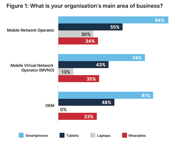 根据《User appetites for frictionlesseSIM activation》给出的调查结果,从全球的电信运营商来看,其中智能手机已经成为eSIM业务的主要领域,平板电脑位居次席,笔记本电脑、可穿戴设备和物联网设备占到约三分之一。而虚拟运营商的eSIM设备业务略有不同,尽管智能手机同样是其主要业务,但平板电脑和笔记本电脑的业务占比较少。
