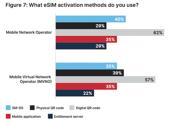 根据近期Thales与MobileWorldLive共同开展的调查报告《User appetites for frictionlesseSIM activation》,目前最受欢迎的激活方式为数字二维码,62%的MNO和57%的MVNO正在使用这种方式。其次最受欢迎的方法是SM-DS,40%的MNO和略高于三分之一的MVNO选择了这一方法。使用移动应用程序激活eSIM配置文件的比例与SM-DS相近。