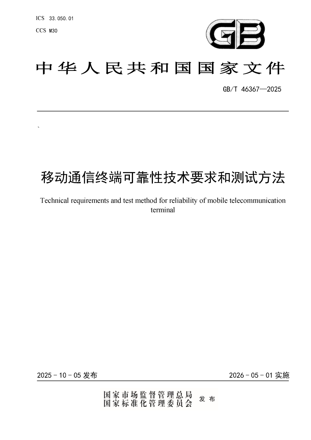 11 月 20 日消息,据泰尔终端实验室今日消息,2025 年 10 月 5 日,由中国信息通信研究院(简称“中国信通院”)牵头制定的移动通信终端可靠性国家标准 GB/T 46367-2025《移动通信终端可靠性技术要求和测试方法》正式发布,将于 2026 年 5 月 1 日起全面实施。