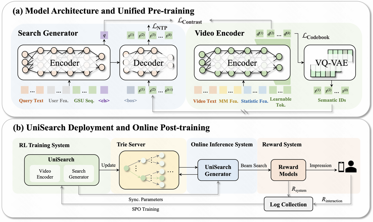 传统搜索如同依赖固定目录的“图书管理员”,只能通过关键词逐一匹配内容,面对口语化提问、实时需求时常常力不从心。而快手此次推出的双技术方案,打破了这一局限:UniDex以视频语义ID为核心,重构了搜索引擎的检索大脑,用智能语义表征替代传统关键词索引,让系统响应速度提升25%的同时,大幅降低了计算资源消耗;UniSearch则首创编码与生成联训的架构,让搜索能直接“生成”符合用户需求的内容推荐,尤其在直播搜索场景中,带动直播间进间数实现近两年最大幅度增长。