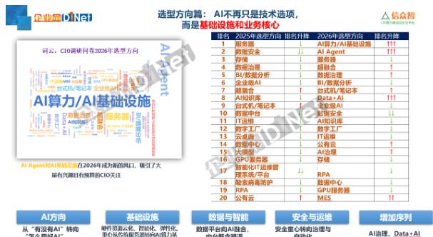 彭俊在演讲中还指出,当AI Agent颠覆传统认知,当算力基础设施取代服务器成为新战场,CIO群体正经历着前所未有的职业危机——平均3-5年的任期背后,是经济下行压力、业务价值交付困境与网络安全合规的三重绞杀。2025年预算回暖信号中,央国企成为投资主力军,但RPA等传统领域优化与存储设施投入放缓的现实,揭示着技术选型的结构性变革:数据平台向AI融合、安全重心转向治理自动化,中台概念逐渐褪色。