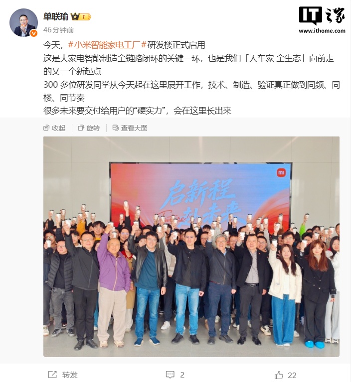 11 月 27 日消息,小米集团大家电部总经理单联瑜在微博发文称,今天小米智能家电工厂研发楼正式启用。