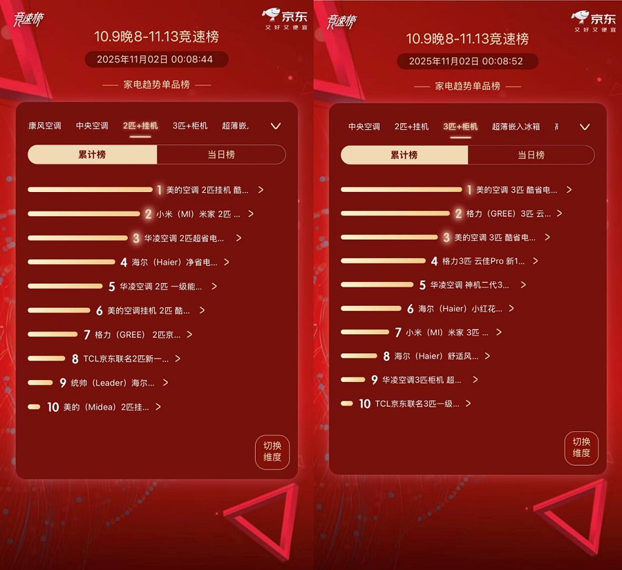 今年双11大促如火如荼,空调消费市场尤为火热。在最新战报中,美的系表现依然突出,强势登顶淘系全站空调品牌榜、抖音商城空调品牌榜榜首、京东52H开门红多项冠军,实现全平台第一。作为美的空调的王牌产品酷省电系列表现亮眼,席卷了双11多个家电趋势单品榜首;美的中央空调持续霸榜京东双11家电趋势单品榜销量冠军。而子品牌华凌神机二代系列自1月开卖至双11首战已销售突破100万套,用户满意度高达99.6%;亮眼成绩答卷的背后,是美的空调从”功能需求“向满足用户”情绪共鸣“价值逻辑的转变,精准契合情感消费行业趋势。