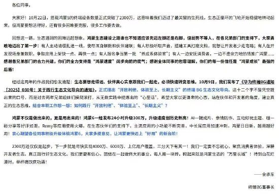 余承东内部信:鸿蒙5终端突破2300万仅是起步,尽快实现上亿用户覆盖,三分天下有其一