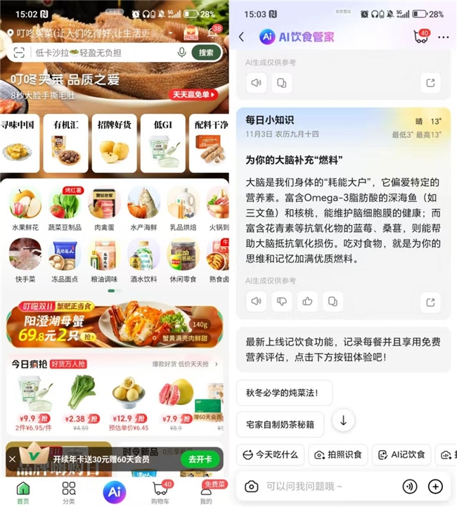 在用户服务上,AI可以提供个性化食谱推荐和健康饮食建议,还可以实现VoC洞察与服务升级。以今年5月叮咚买菜上线的AI智能饮食管家为例,其具有个性化对话、饮食记录、菜谱推荐、营养建议、语音定制餐食等功能,一系列功能叠加可以构建健康消费闭环。这也意味着,叮咚买菜正在从购物平台转化成用户的家庭健康饮食管家。