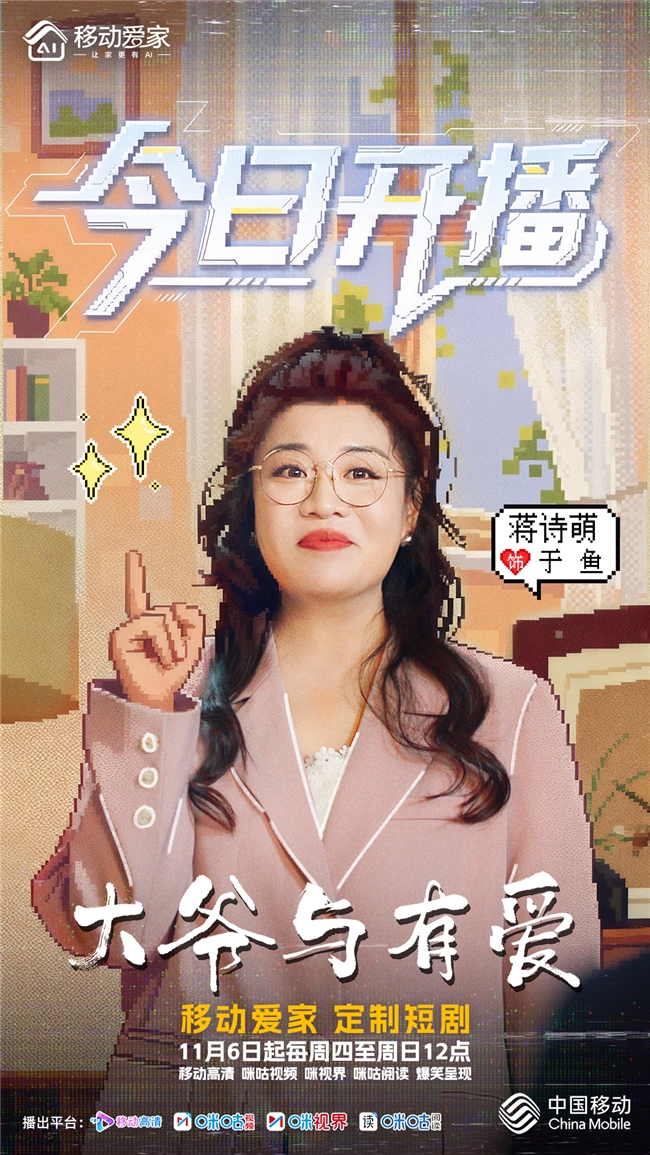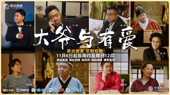 11月6日,中国移动移动爱家定制奇幻生活短剧《大爷与有爱》正式登陆移动高清、咪咕视频、咪视界、咪咕阅读等平台。本剧由中国移动“移动爱家”独家定制,于谦、蒋诗萌、泰维领衔主演,孙越、李宗恒、关凌、杨青、卜钰、曹贺军、童飞、周英俊、刘宏禄等特邀主演,聚焦当代家庭生活,从退休大爷于有艾(于谦 饰)的视角切入,通过一系列奇幻色彩的爆笑故事,以不同代际间跨越年龄的双向互动,引发观众对当下生活与爱的深度思考。