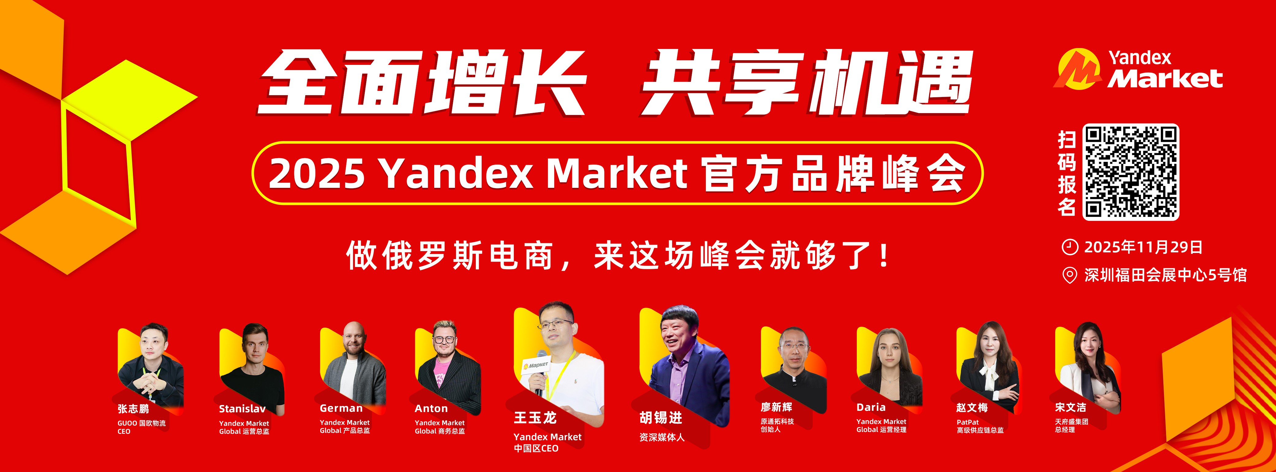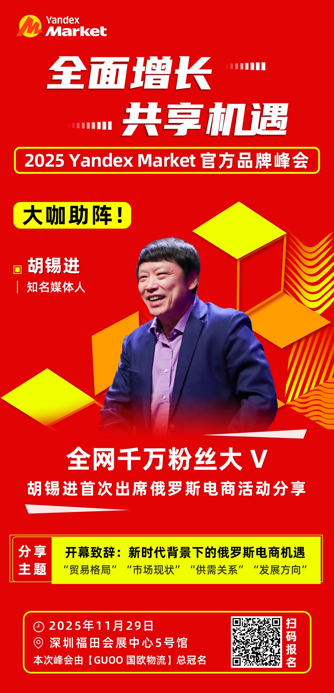 为了帮助中国卖家共享俄罗斯电商市场增长机遇,俄罗斯领先的电商平台Yandex Market将于11月29日,在深圳福田会展中心5号馆主办2025 Yandex Market官方品牌峰会。峰会由GUOO国欧物流总冠名,天府盛国际物流晚宴冠名,旨在为跨境电商卖家入局俄罗斯电商提供从选品,运营,广告,服务生态等全方位支持。峰会力邀千万粉丝知名媒体人胡锡进出席致辞,这也是胡锡进首次参加俄罗斯电商活动。将在现场分享新时代背景下的俄罗斯电商机遇。现场更有俄罗斯电商运营全链条资源一站式对接。开启俄罗斯电商市场,这场峰会就够了!