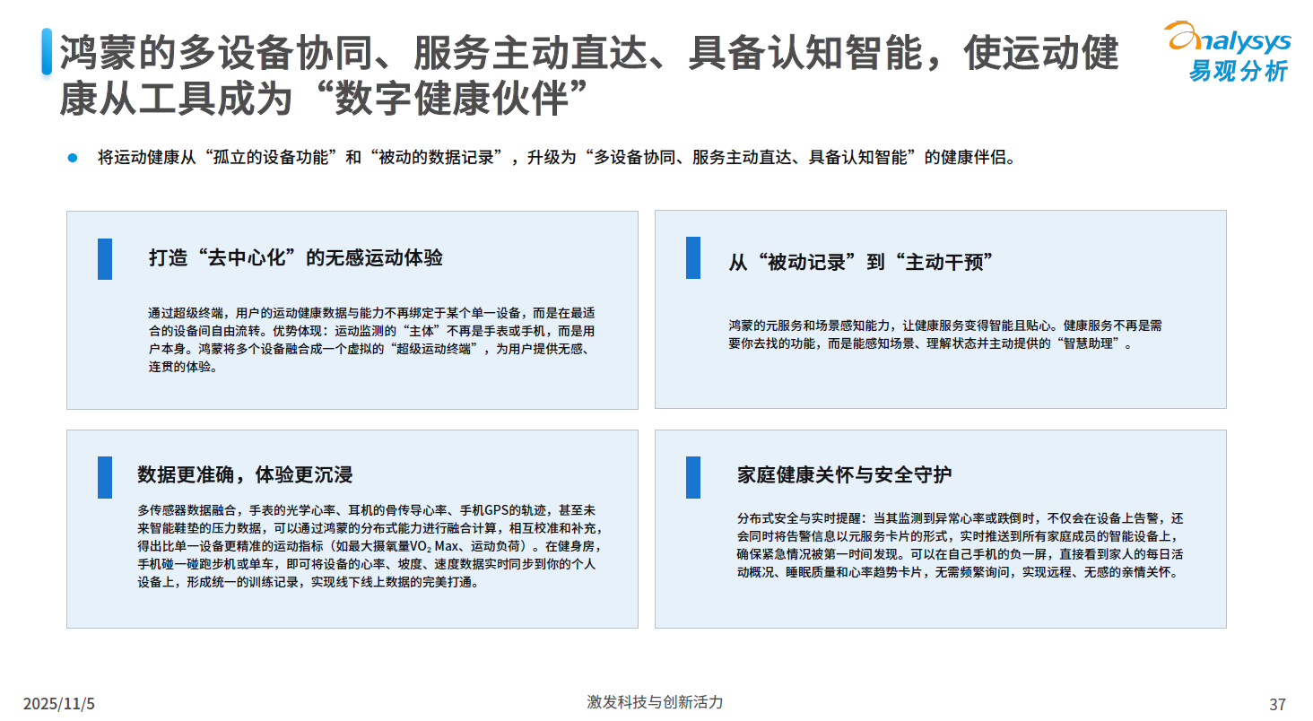开发建议:针对医疗健康与体育文化赛道,开发者可以设计出跨设备体验。例如,在医疗健康赛道,开发应用可将手表(心率监测)与智慧屏(AI健身指导)无缝协同;在体育文化赛道,打造应用可实现手机(数据)与智慧屏(赛况)的多屏联动,创造独一无二的用户体验。