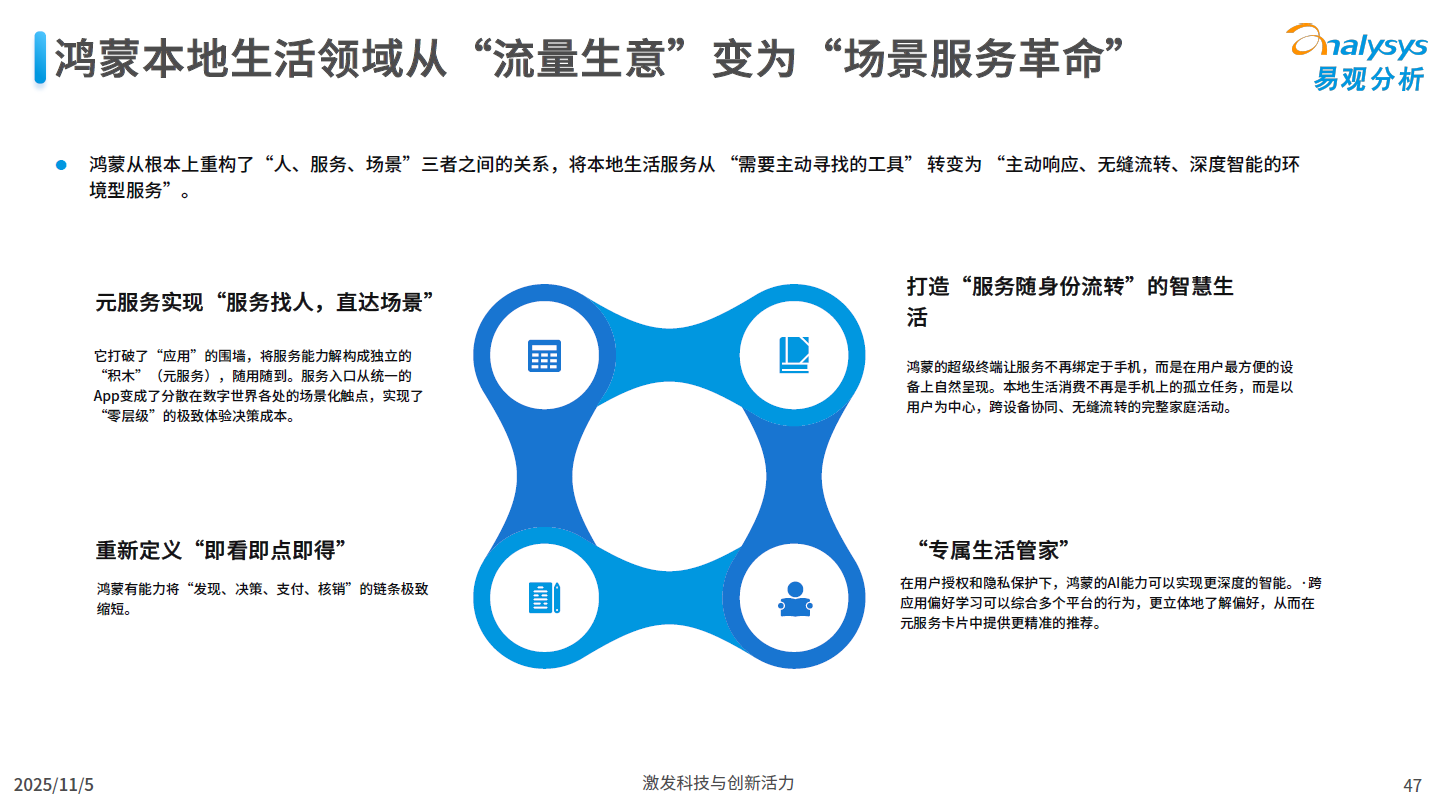为了加速这一进程,华为已启动鸿蒙“天工计划”,投入10亿元专项激励AI生态创新 ,并保持每年超过60亿元的投入支持开发者创新。对于开发者和投资者而言,最好的时机永远是“当下”。易观报告所揭示的十大高潜力赛道,正是鸿蒙生态版图上亟待开拓的关键领域。与其在红海中消耗,不如在新生态的蓝海中启航。