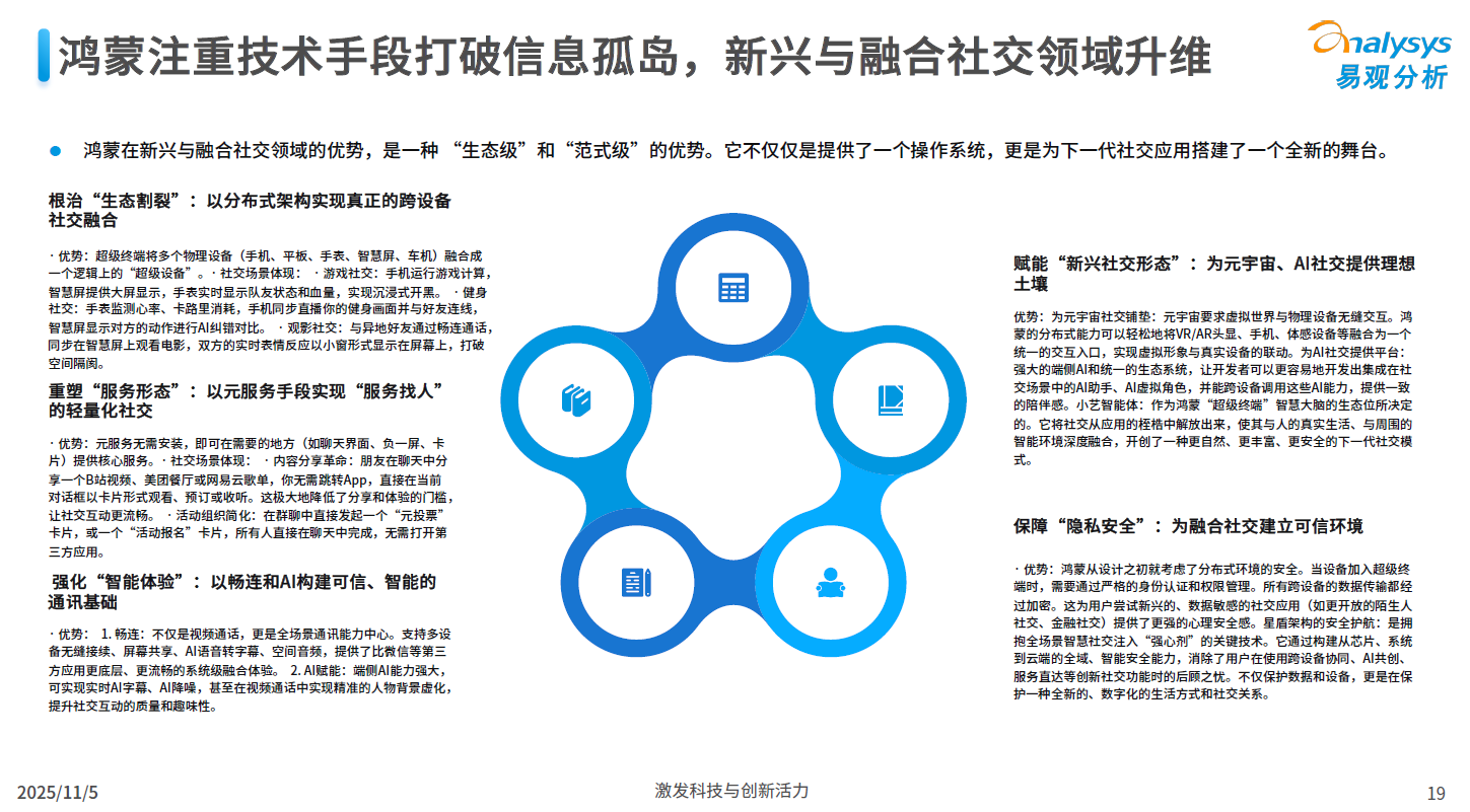 以社交通讯为例,报告特别指出,“新兴与融合社交”领域是一个潜力巨大的新兴市场。鸿蒙可以利用技术手段打破信息孤岛,以分布式架构实现跨设备社交融合(如游戏、健身、观影社交);以元服务实现“服务找人”的轻量化社交;以AI构建智能通讯基础,为元宇宙、AI社交提供理想土壤。