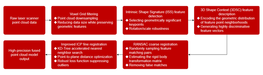 为破解这一技术难题,微算法科技(NASDAQ:MLGO)成功推出了一种全新的激光扫描仪点云快速配准算法。该方法在经典迭代最近点(ICP)框架的基础上,巧妙结合了随机样本一致性(RANSAC)、内在形状签名(ISS)和三维形状上下文(3DSC)等多种先进技术,不仅在大规模点云数据处理上实现了显著提速,同时在配准精度上也保持了优异表现。这一成果标志着点云数据处理技术向高效、精准方向迈出重要一步,有望推动三维数据应用进入新的发展阶段。