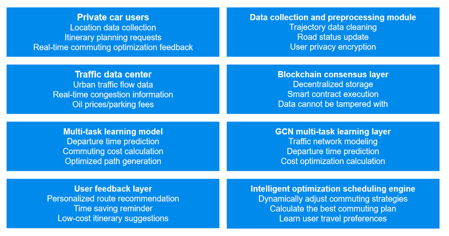 在系统架构方面,该模型主要包括三个关键模块,数据采集与隐私保护模块、区块链共识机制、智能通勤优化引擎。