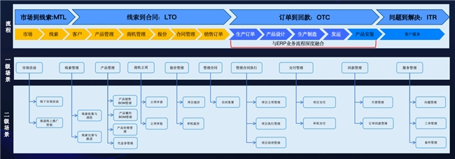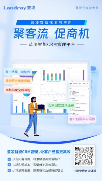 蓝凌智能CRM利用MK低代码平台的基座能力,打通了MTL(市场到线索)、LTO(线索到合同)、OTC(订单到回款)、ITR(问题到解决)的业务模块,构建从市场到线索、商机、合同、交付、回款、服务的全流程在线闭环。