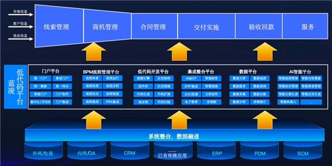 针对该企业的痛点,蓝凌为其打造了基于MK低代码平台的智能CRM解决方案,聚焦企业LTC全流程实现三大重构,全面激活企业数智能力。