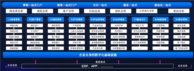 平台利用AI低代码能力,快速开发配置了多类智能应用,包括营销、销售、交付、服务等一站式门户,以及9大核心管理模块,助力全流程智能管理。