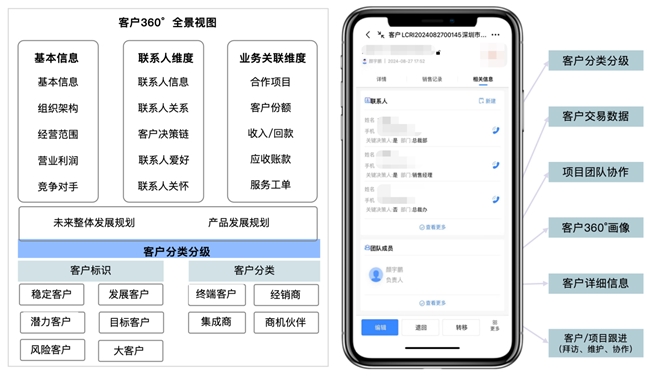 构建360°客户画像系统,深度整合工商、规模、行业等基本信息、业务关联数据、联系人关系,甚至包含客户工艺需求等,支撑业务员快速掌握客户核心诉求。