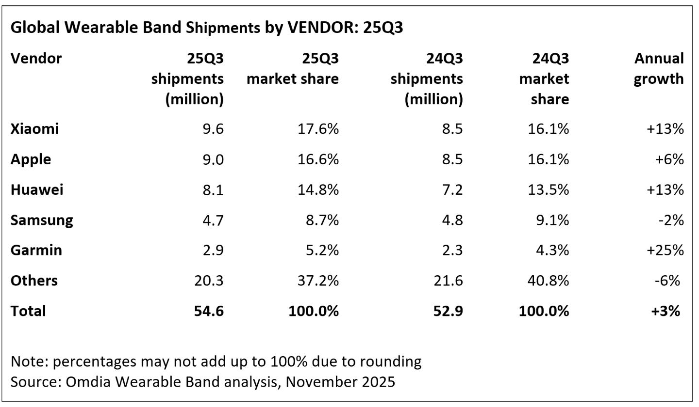 Omdia 报告 2025Q3 全球可穿戴腕带设备出货量:小米同比增 13%、苹果增 6%、华为增 13%、三星降 2%、佳明增 25%