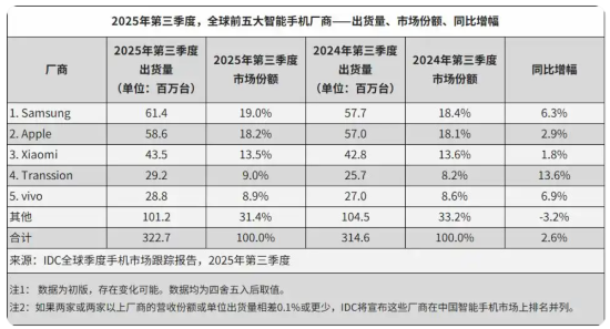 经历连续多年的市场调整后,全球智能手机行业在2025年迎来明确的复苏信号,这种复苏并非简单的量能回升,而是伴随结构优化的高质量增长。从全球市场来看,IDC公布数据显示,今年第三季度全球智能手机出货量同比增长2.6%,结束了此前的波动调整态势,复苏动力主要来自两方面:一是积压的换机需求逐步释放,二是头部厂商的AI创新与形态升级有效激活了消费意愿,AI手机、AIPC、AI眼镜等新形态设备加速落地,行业竞争从单一产品比拼,转向以全场景体验为核心的生态构建。