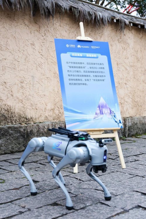 四足机器人不仅能够送递咖啡,还能化身“智能跟拍摄影师”。5G-A为前沿机器人应用提供大上行、高可靠的“运动神经” ,四足机器人前置高清摄像头可以捕捉被跟随人的图像,通过5G-A大上行技术高频上传图像到云端处理,为人们提供高画质影像记录。同时,四足机器人化身智慧园区“生态巡检官”,浑身搭载着7只“火眼金睛”,头顶全景相机实时拼接360°巡逻画面,能迅速进行人脸、行为和车牌识别。得益于先进的运动控制算法和5G-A大上行广覆盖能力,实时高清回传视频与传感器数据,助力智能化立体化安防与生态管理。