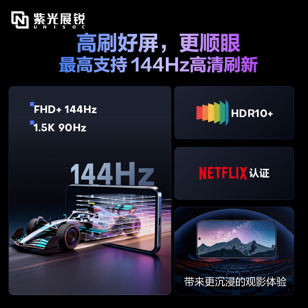 T9300支持FHD+ 144Hz高刷新率,并可适配1.5K 90Hz等多样化屏幕方案,为各类产品提供更灵活的配置空间,配合HDR10+、VRR动态刷新率和VideoPQ动态对比度调节,T9300在应用浏览、视频播放及游戏场景中,呈现更细腻连贯的画面表现,使用户能在更多使用场景中感受到超清、稳定的沉浸视觉体验。