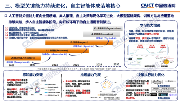 中国信通院结合OpenAI和英伟达黄仁勋提出的“AI发展阶段”研判:2025年,随着大模型的基础架构、训练方法与应用落地持续突破,代理AI驱动的智能体L3时代已经到来,正向开放环境下的自主通用智能演进。未来三年,AI将全面进入智能体时代并在部分专业领域实现L4创新者阶段的初步突破;未来五年,将在更多垂直领域落地成熟的创新者能力,同时开启多智能体协同的组织者L5阶段,重塑产业生态的底层规则。