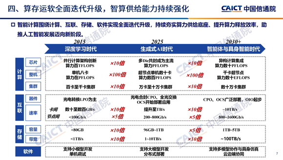 智能计算围绕计算、互联、存储和软件全面迭代升级,推动生成式AI迈向智能体和具身智能时代。计算上,单卡多芯片成为主流,超节点爆发,万卡集群加速构建,2030年异构计算集成是主流,整机和集群容量大增;数据中心互联呈现光电融合趋势,速率提升显著;存储容量和带宽大幅提升;软件向多模态协作等方向发展。网络能力持续发展,支撑万物智联与AI发展,移动和固定宽带向万兆提升,骨干网络加速向超宽带全光底座演进,推进算网融合,以实现泛在连接与算力资源敏捷供给。