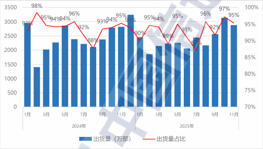 2025 年 11 月,智能手机出货量 2875.1 万部,同比增长 2.0%,占同期手机出货量的 95.3%;智能手机上市新机型 24 款,同比下降 7.7%,占同期手机上市新机型数量的 77.4%。