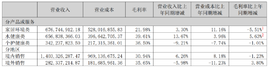 此外,毛利率的变化也值得关注。尽管德尔玛在业内以代工小米、飞利浦而出名,但三大品类中有两大品类出现了毛利率下降的情况。根据半年度财报,其家居环境类产品毛利率同比下降5.51%,水健康类产品毛利率同比提升5.63%,个护健康类产品毛利率同比下降1.01%。
