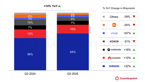 12月3日消息,根据Counterpoint Research发布《折叠屏智能手机市场追踪》报告显示,2025年Q3全球折叠屏智能手机出货量同比增长14%,创下该品类季度出货量历史新高。
