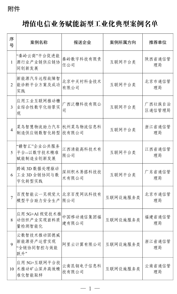 飞象网讯(致新/文)12月31日消息,工信部信息通信管理局发文称,根据《工业和信息化部办公厅关于开展增值电信业务赋能新型工业化典型案例征集工作的通知》,经企业自主申报、地方推荐、专家评审和复核,现将评选出的增值电信业务赋能新型工业化典型案例进行公示,请社会各界监督。如有异议,请于公示期内提出书面反馈意见,并明确提出异议的事实依据、真实姓名、工作单位和联系方式等。