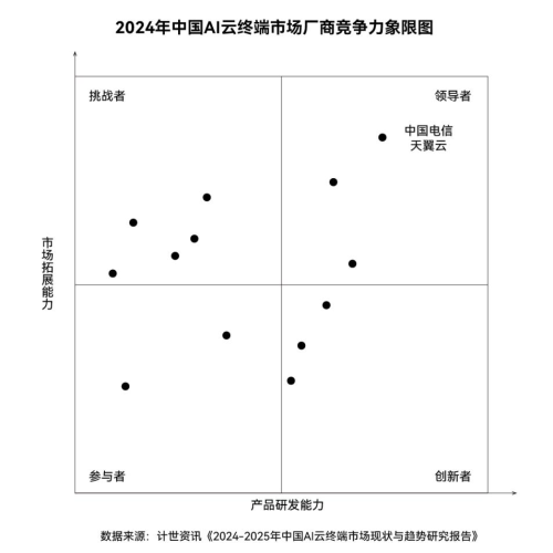 近日,计世资讯发布《2024-2025年中国AI云终端市场现状与趋势研究报告》,报告显示,中国电信天翼云凭借优秀的客户基础和领先的产品创新能力,入选2024年中国AI云终端市场厂商竞争力象限领导者域,市场拓展能力、产品研发能力均位居象限第一。