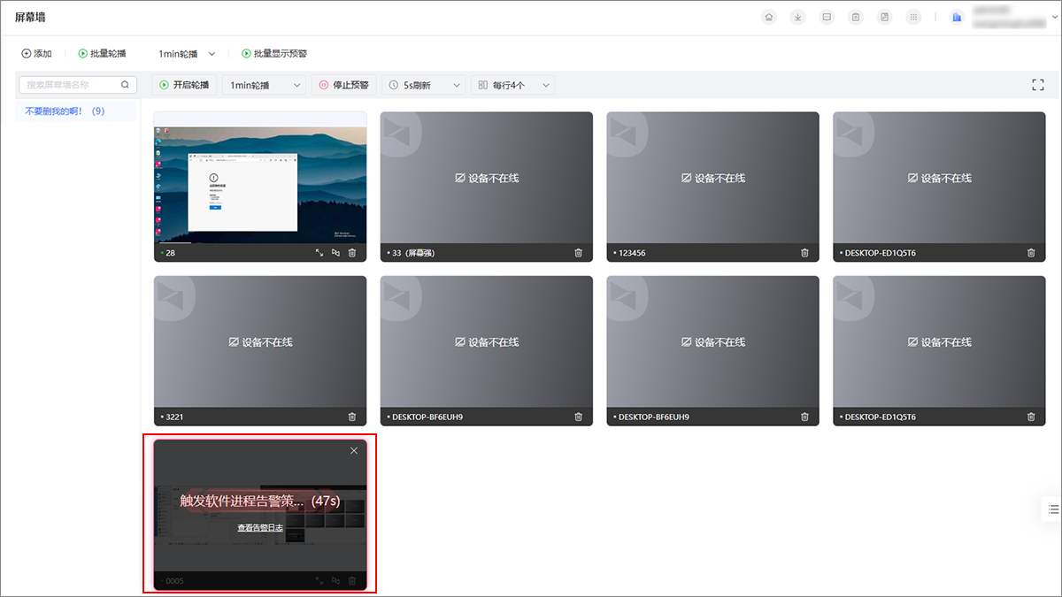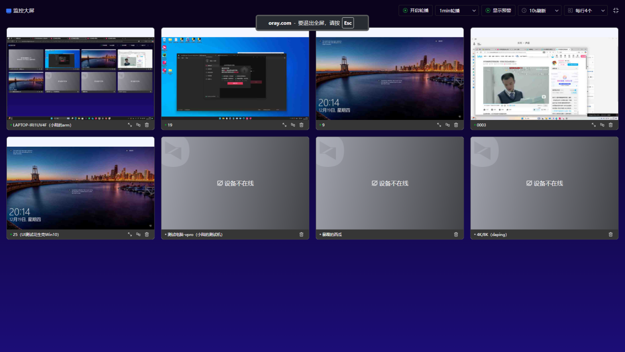 此外,新版屏幕墙支持动态轮播和沉浸式全屏展示;当设备数量过多而单一显示器展示不下的时候,我们可以设置轮播时间,定时切换监控的设备,保证所有设备的屏幕信息都有一定的展示时间。