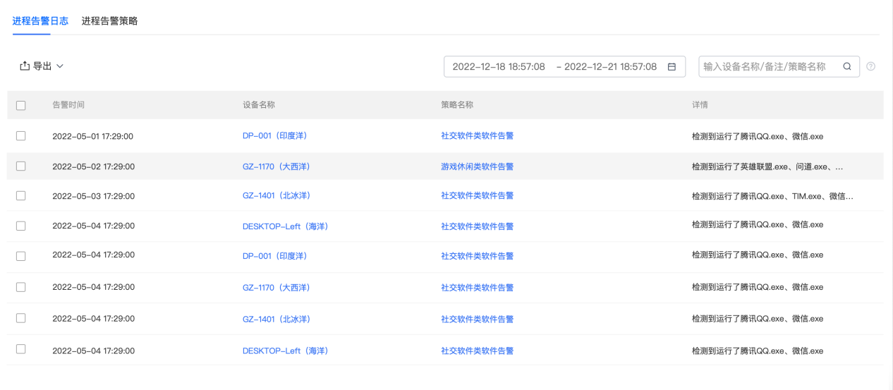 对于设备上的软件安装,向日葵IT资产管理功能也提供了管理手段:通过“软件进程告警”功能,我们可以为不同的设备(也支持按安装包区分策略)设置软件告警策略,添加需要检测告警的软件进程名称,当设备运行对应软件时,向管理员发出告警。