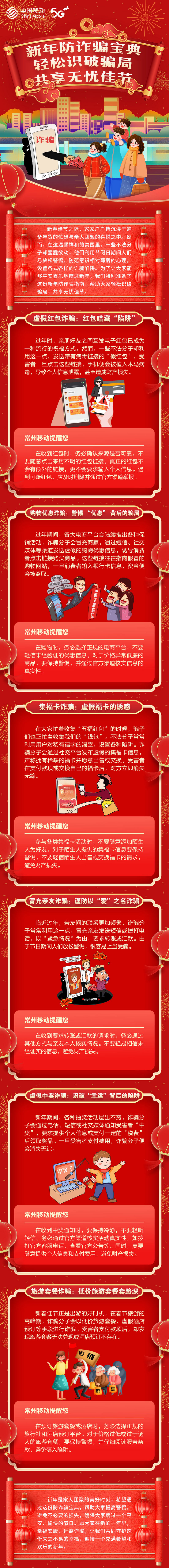 新春佳节之际,家家户户皆沉浸于筹备年货的忙碌与亲人团聚的喜悦之中。然而,在这温馨祥和的氛围里,一些不法分子却蠢蠢欲动,他们利用节假日期间人们易放松警惕、防范意识相对薄弱的心理,设置各式各样的诈骗陷阱。为了让大家能够平安喜乐地度过新年,常州移动特别准备了这份新年防诈骗指南,帮助大家轻松识破骗局,共享无忧佳节。