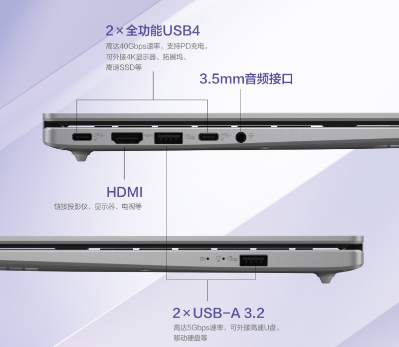 华硕无畏14 骁龙版 2025配备一块14英寸的16:10大视野护眼显示屏,可视角度高达178°,DC调光有效降低频闪,智能环境光感应器还可自动监测环境变化,自动调节亮度及色温。在14寸的机身上,无畏14 骁龙版提供了2×全功能USB4接口、2×USB-A 3.2接口、HDMI 2.1 TMDS及3.5mm音频接口,扩展设备无压力。