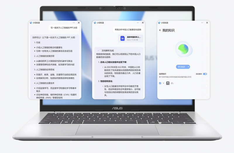 华硕无畏14 骁龙版 2025搭载了全新骁龙X处理器,8颗高性能CPU核心,4nm先进工艺赋予其远胜以往的运算表现,日常使用功耗超低,告别风扇起飞和键盘烫手。支持流畅播放4K 60帧超高清视频。内置45TOPS高性能NPU引擎,支持多个AI智能体运行及本地大模型计算。拥有16GB 8448MT/s LPDDR5X内存以及PCIe 4.0 SSD,可流畅运行华硕全新“小硕知道”AI智能体。基于端侧大模型提供的出色AI性能,可实现智慧问答、文档总结、AI绘图、AI识图等多项功能。强大的硬件实力与出色的AI软件适配,让每一位用户都可享受到无与伦比的智慧体验。