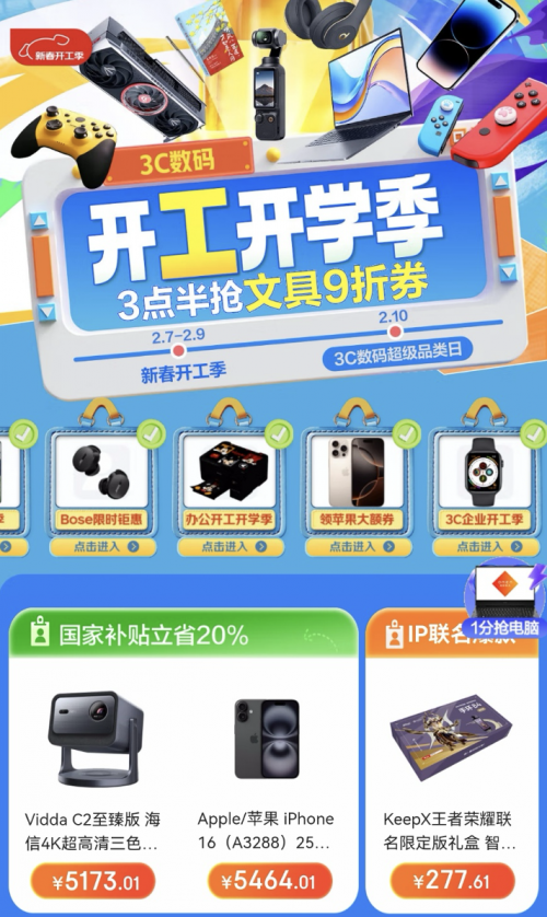 开工的号角已然吹响,开学的计划也即将提上日程。2月10日,京东3C数码超级品类日火热上线,海量高品质的开工开学装备享国家补贴,电脑等3C好物立减2000元,手机、平板、智能手表等好物享售价15%的国家补贴。不仅如此,还有每天下午3点半的文具折上9折、图书谷子单件9折叠加满99减10元等实在福利,更有百款IP文具1分钱抢的超级福利,抽IP文具盲盒100%中奖率,每天解锁不重样的IP盲盒!值得一提的是,2月15、16两天,在北京通州万达广场1F和上海闵行龙湖天街商区1F将有4场IP谷子快闪活动,为“谷圈人”带来一场专属狂欢。打开京东APP搜“3C开工开学”即可进入活动会场,万千好物,又好又便宜!