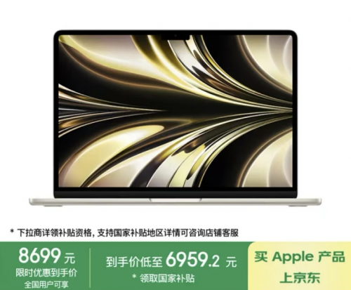 笔记本电脑是职场打拼的“武器”。13.6英寸的苹果AI笔记本MacBook Air,搭载新一代芯片M2,便携性超高、实力超强,在工作、娱乐和创作中都可以尽情发挥所能。日常售价8699元,京东下单享国家补贴优惠20%,到手价6959.2元。
