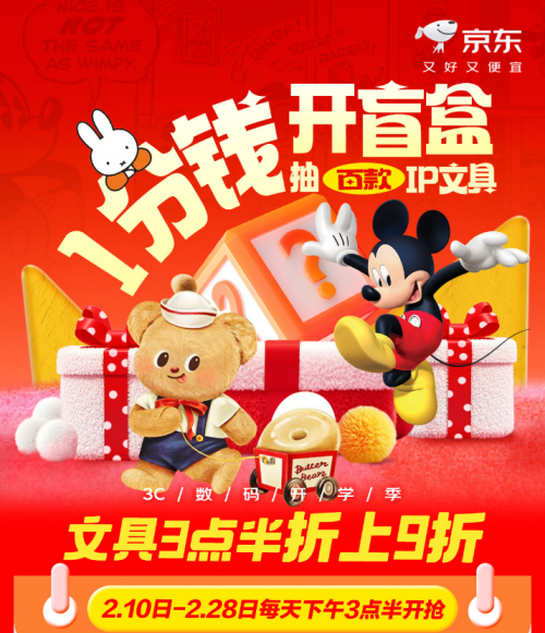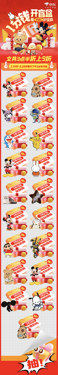 除了AI学习机,文具也是即将开学的学生家长们需要提前准备的。为了满足更多消费者省钱省心入手品牌文具的需求,2月10日至2月28日,每天下午3点半,迪士尼、卡皮巴拉、三丽鸥、时空舱、哆啦A梦、宝可梦、蜡笔小新、黄油小熊、变形金刚等超百款IP文具只需1分钱即可开抢。打开京东APP搜索“文具3点半”,享受折上9折优惠,不容错过。